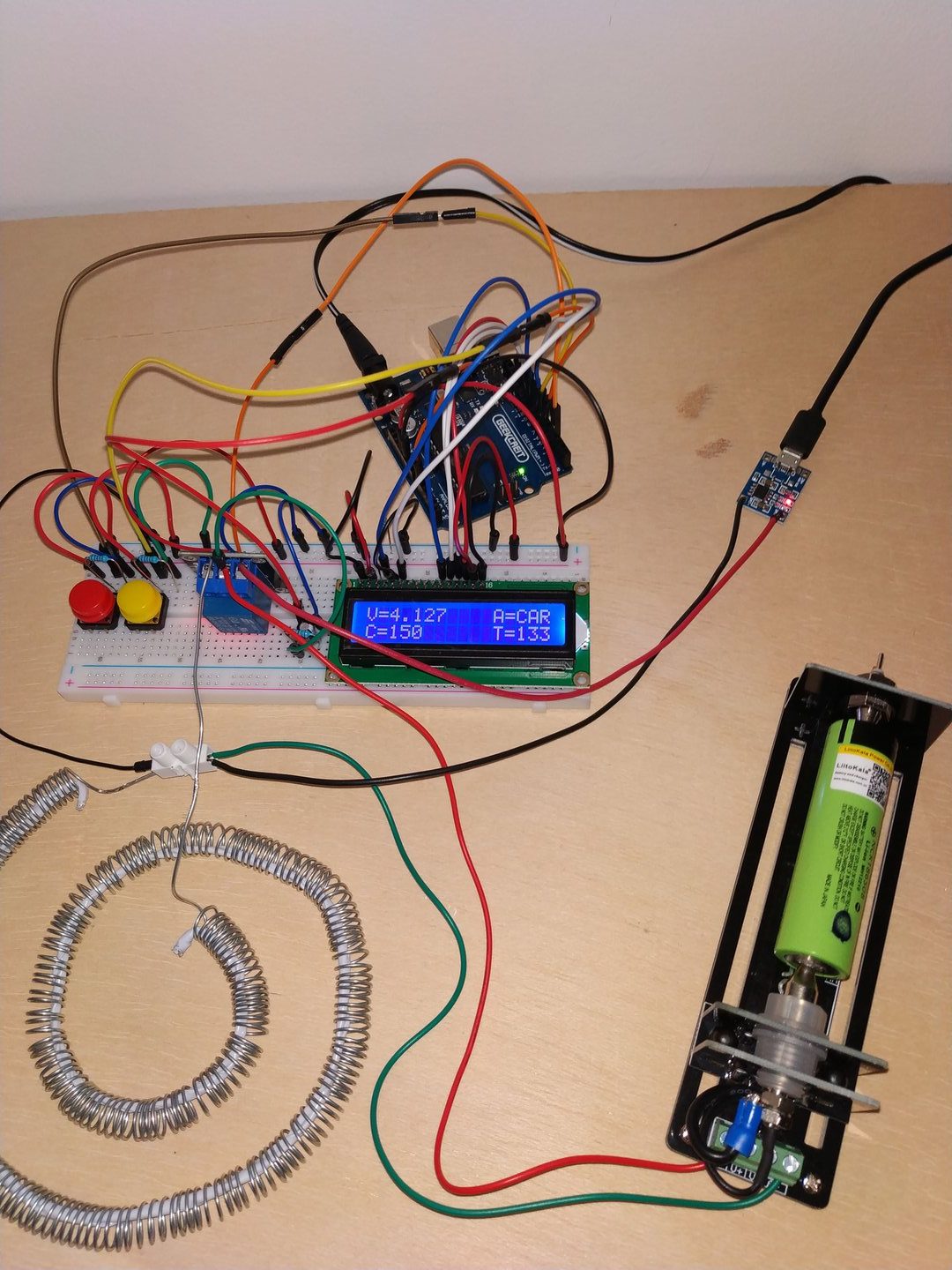 Para la descarga se emplea la resistencia casera que se ve en la foto (es ese alambre enroscado). Lo he calibrado para que descargue a una intensidad de 2A (aprox).